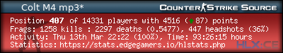 | 12 | Colt M4 - mp3 | 0d 00:48:34h | 2025-05-12 22:19:20 | 11 | 28 | 0.39 | 2 | 0.18 | 0 | 0.0% |