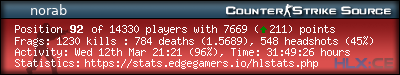 | 1 | =(eGO)= | DUST2 | NO AWPS/AUTOS | EdgeGamers.com | 136 | 100.00% | 82 | 1.6585 | 73 | 100.00% | 0.5368 |