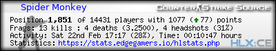 Rank | Server | Kills | % | Ratio | Deaths | K:D | Headshots | Percentage of Headshots | % | HS:K |