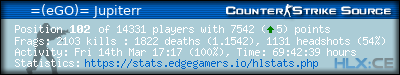 1 | =(eGO)= | DUST2 | NO AWPS/AUTOS | EdgeGamers.com | 1,295 | 100.00% | 1,290 | 1.0039 | 698 | 100.00% | 0.5390 |