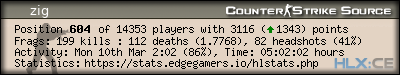 Rank | Server | Kills | % | Ratio | Deaths | K:D | Headshots | Percentage of Headshots | % | HS:K |