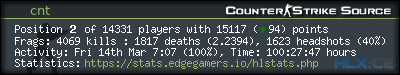 | 1 | =(eGO)= | DUST2 | NO AWPS/AUTOS | EdgeGamers.com | 633 | 100.00% | 332 | 1.9066 | 316 | 100.00% | 0.4992 |