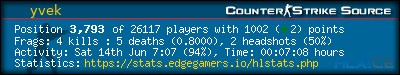 Rank | Map | Kills | % | Ratio | Deaths | % | Ratio | K:D | Headshots | % | Ratio | HS:K |