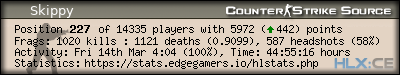 | Rank | Server | Kills | % | Ratio | Deaths | K:D | Headshots | Percentage of Headshots | % | HS:K |