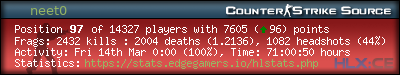 1 | =(eGO)= | DUST2 | NO AWPS/AUTOS | EdgeGamers.com | 698 | 100.00% | 512 | 1.3633 | 328 | 100.00% | 0.4699 |