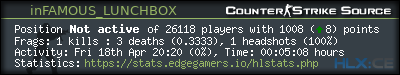 | 4 | inFAMOUS_LUNCHBOX | 0d 00:05:08h | 2025-04-18 20:59:07 | 1 | 3 | 0.33 | 1 | 1.00 | 0 | 0.0% |