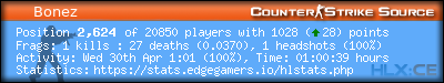 | Rank | Server | Kills | % | Ratio | Deaths | K:D | Headshots | Percentage of Headshots | % | HS:K |
