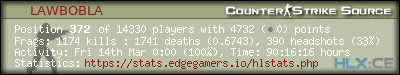 | 1 | =(eGO)= | DUST2 | NO AWPS/AUTOS | EdgeGamers.com | 84 | 100.00% | 123 | 0.6829 | 26 | 100.00% | 0.3095 |