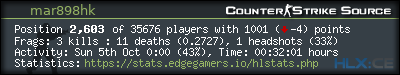 Rank | Map | Kills | % | Ratio | Deaths | % | Ratio | K:D | Headshots | % | Ratio | HS:K |