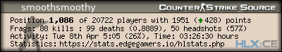 Rank | Server | Kills | % | Ratio | Deaths | K:D | Headshots | Percentage of Headshots | % | HS:K |