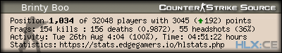 | Rank | Name | Time | Last Use | Kills | Deaths | K:D | Headshots | HS:K | Suicides | Accuracy |