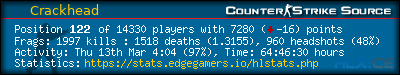 | Rank | Map | Kills | % | Ratio | Deaths | % | Ratio | K:D | Headshots | % | Ratio | HS:K |