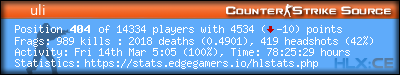 | Rank | Name | Time | Last Use | Kills | Deaths | K:D | Headshots | HS:K | Suicides | Accuracy |