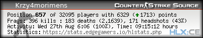 1 | =(eGO)= | DUST2 | NO AWPS/AUTOS | EdgeGamers.com | 1,198 | 100.00% | 654 | 1.8318 | 490 | 100.00% | 0.4090 |