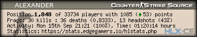 | 1 | =(eGO)= | DUST2 | NO AWPS/AUTOS | EdgeGamers.com | 165 | 100.00% | 185 | 0.8919 | 101 | 100.00% | 0.6121 |