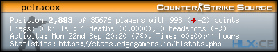 Rank | Map | Kills | % | Ratio | Deaths | % | Ratio | K:D | Headshots | % | Ratio | HS:K |