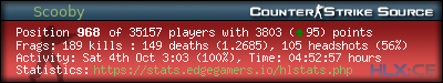 Rank | Server | Kills | % | Ratio | Deaths | K:D | Headshots | Percentage of Headshots | % | HS:K |