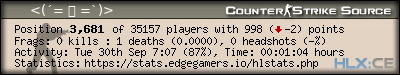Rank | Map | Kills | % | Ratio | Deaths | % | Ratio | K:D | Headshots | % | Ratio | HS:K |