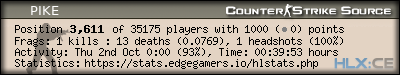 Rank | Map | Kills | % | Ratio | Deaths | % | Ratio | K:D | Headshots | % | Ratio | HS:K |
