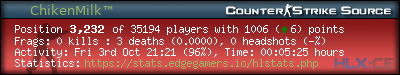 Rank | Map | Kills | % | Ratio | Deaths | % | Ratio | K:D | Headshots | % | Ratio | HS:K |