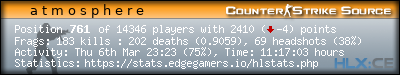 | 1 | =(eGO)= | DUST2 | NO AWPS/AUTOS | EdgeGamers.com | 526 | 100.00% | 723 | 0.7275 | 178 | 100.00% | 0.3384 |