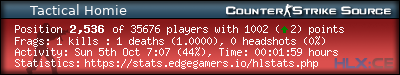 Rank | Map | Kills | % | Ratio | Deaths | % | Ratio | K:D | Headshots | % | Ratio | HS:K |