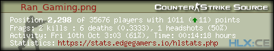 Rank | Map | Kills | % | Ratio | Deaths | % | Ratio | K:D | Headshots | % | Ratio | HS:K |