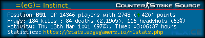 1 | =(eGO)= | DUST2 | NO AWPS/AUTOS | EdgeGamers.com | 318 | 100.00% | 144 | 2.2083 | 218 | 100.00% | 0.6855 |