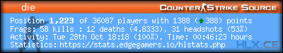 | 1 | =(eGO)= | DUST2 | NO AWPS/AUTOS | EdgeGamers.com | 58 | 100.00% | 12 | 4.8333 | 31 | 100.00% | 0.5345 |