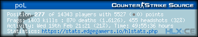 | Rank | Name | Time | Last Use | Kills | Deaths | K:D | Headshots | HS:K | Suicides | Accuracy |