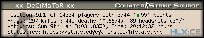 Rank | Map | Kills | % | Ratio | Deaths | % | Ratio | K:D | Headshots | % | Ratio | HS:K |