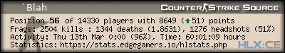| 1 | =(eGO)= | DUST2 | NO AWPS/AUTOS | EdgeGamers.com | 284 | 100.00% | 163 | 1.7423 | 150 | 100.00% | 0.5282 |