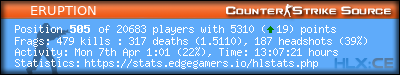 | 1 | =(eGO)= | DUST2 | NO AWPS/AUTOS | EdgeGamers.com | 392 | 100.00% | 261 | 1.5019 | 197 | 100.00% | 0.5026 |