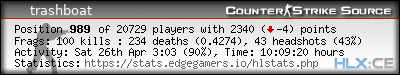 | Rank | Name | Time | Last Use | Kills | Deaths | K:D | Headshots | HS:K | Suicides | Accuracy |