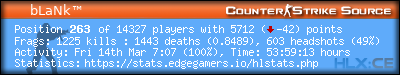 | 1 | de_dust2 | 94 | 100.00% | 287 | 100.00% | 0.33 | 43 | 100.00% | 0.46 |