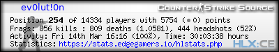 | 1 | =(eGO)= | DUST2 | NO AWPS/AUTOS | EdgeGamers.com | 249 | 100.00% | 212 | 1.1745 | 135 | 100.00% | 0.5422 |