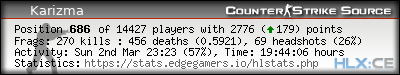 | Rank | Server | Kills | % | Ratio | Deaths | K:D | Headshots | Percentage of Headshots | % | HS:K |