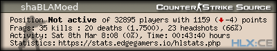 Rank | Map | Kills | % | Ratio | Deaths | % | Ratio | K:D | Headshots | % | Ratio | HS:K |
