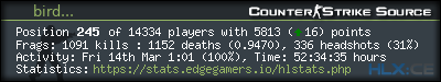 | Rank | Name | Time | Last Use | Kills | Deaths | K:D | Headshots | HS:K | Suicides | Accuracy |