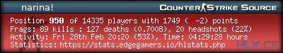 | Rank | Name | Time | Last Use | Kills | Deaths | K:D | Headshots | HS:K | Suicides | Accuracy |