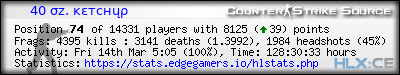 | 1 | =(eGO)= | DUST2 | NO AWPS/AUTOS | EdgeGamers.com | 172 | 100.00% | 117 | 1.4701 | 77 | 100.00% | 0.4477 |